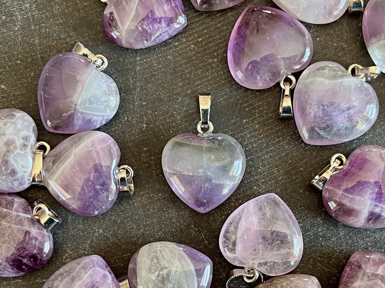 Crafted with precision, this amethyst heart pendant captures the stone's natural gradient of lavender to deep violet tones within a refined puffed silhouette. At 23mm, the piece balances visual presence with wearable elegance. Suspended from a durable stainless steel serpentine chain measuring 20 inches, it combines the aesthetic sophistication of amethyst with practical everyday wear. A thoughtful selection for those who appreciate both the mineral's reputed calming properties and its timeless appeal.