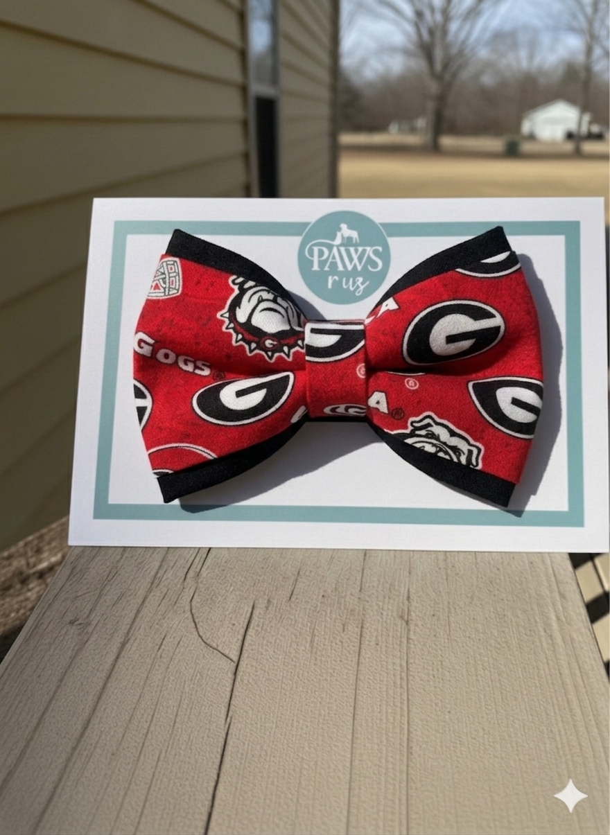 Elevate your Bulldog's fan style with this striking black and red bow tie, inspired by the iconic colors of UGA. Available in three sizes to ensure a perfect fit for dogs of all breeds, this accessory combines spirited team pride with polished sophistication. Whether you're heading to game day or a special occasion, your pup will look championship-ready.