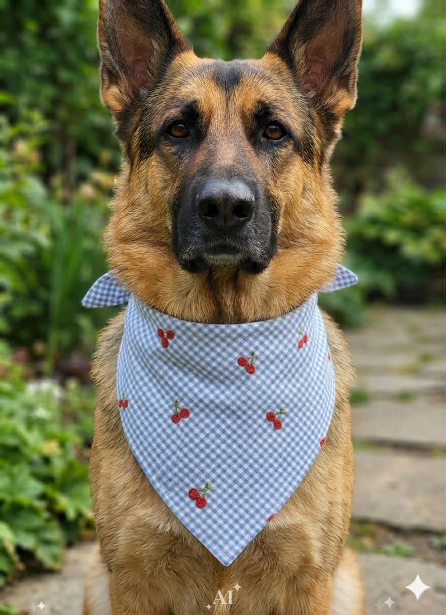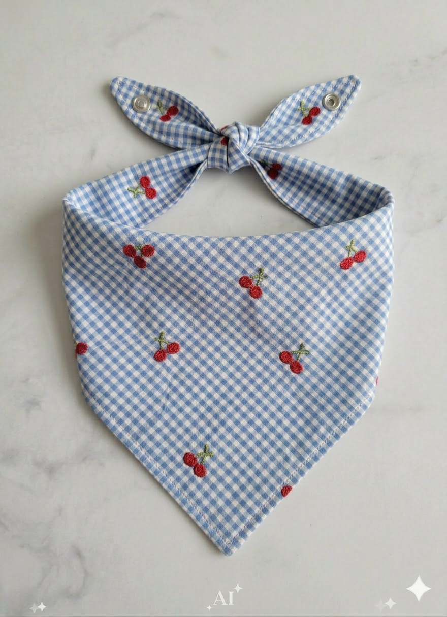 Add a splash of sweetness to your pet's wardrobe! This handcrafted bandana features a classic blue gingham print sprinkled with bright red cherries—the perfect look for summer picnics, park dates, or just lounging at home.