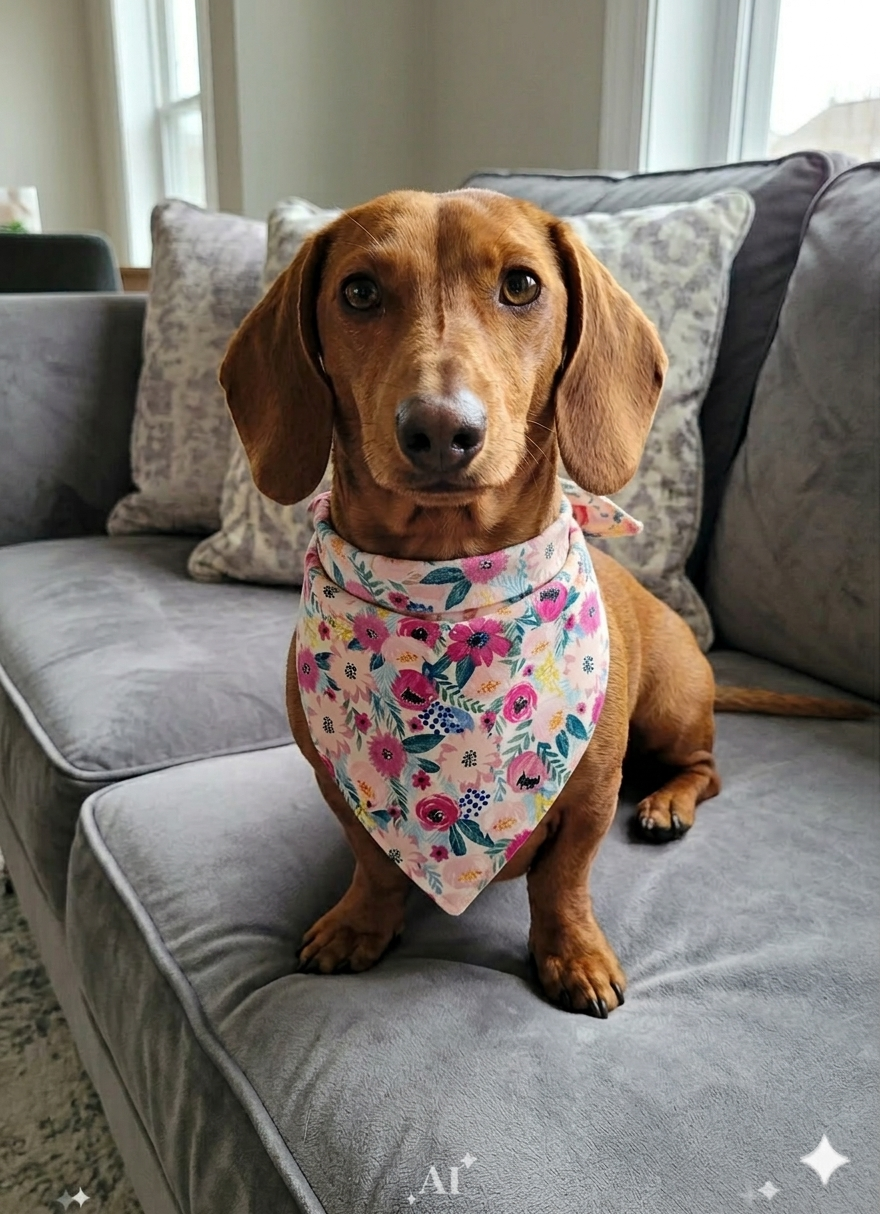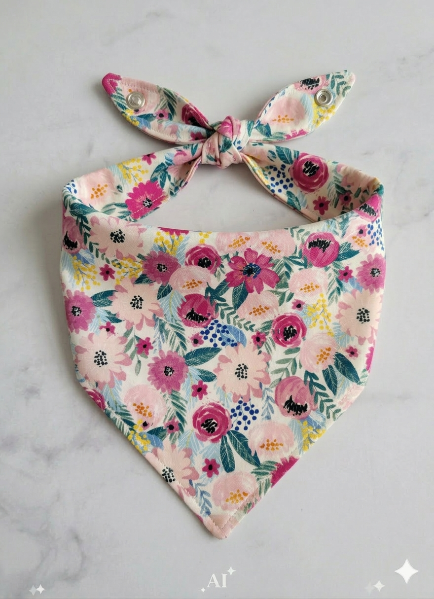 Give your dog or cat a fresh new look with our Handmade Bright Floral Bandana. This vibrant accessory features a multi-colored floral print on premium cotton fabric, making it a perfect addition to your pet’s Spring and Summer wardrobe.