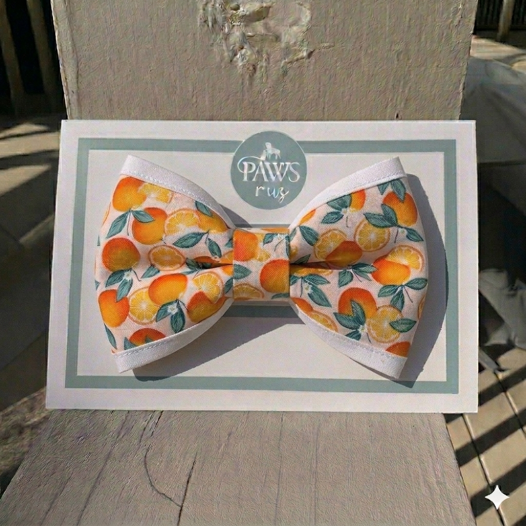 Add a zest of style to your pup's spring wardrobe! Our Citrus Fruit Print Bow Tie is a vibrant, "main squeeze" accessory featuring a refreshing pattern of sliced oranges and lemons. Whether you’re headed to a backyard BBQ, a garden party, or a sunny morning stroll, this bow brings an instant pop of cheer to any collar.