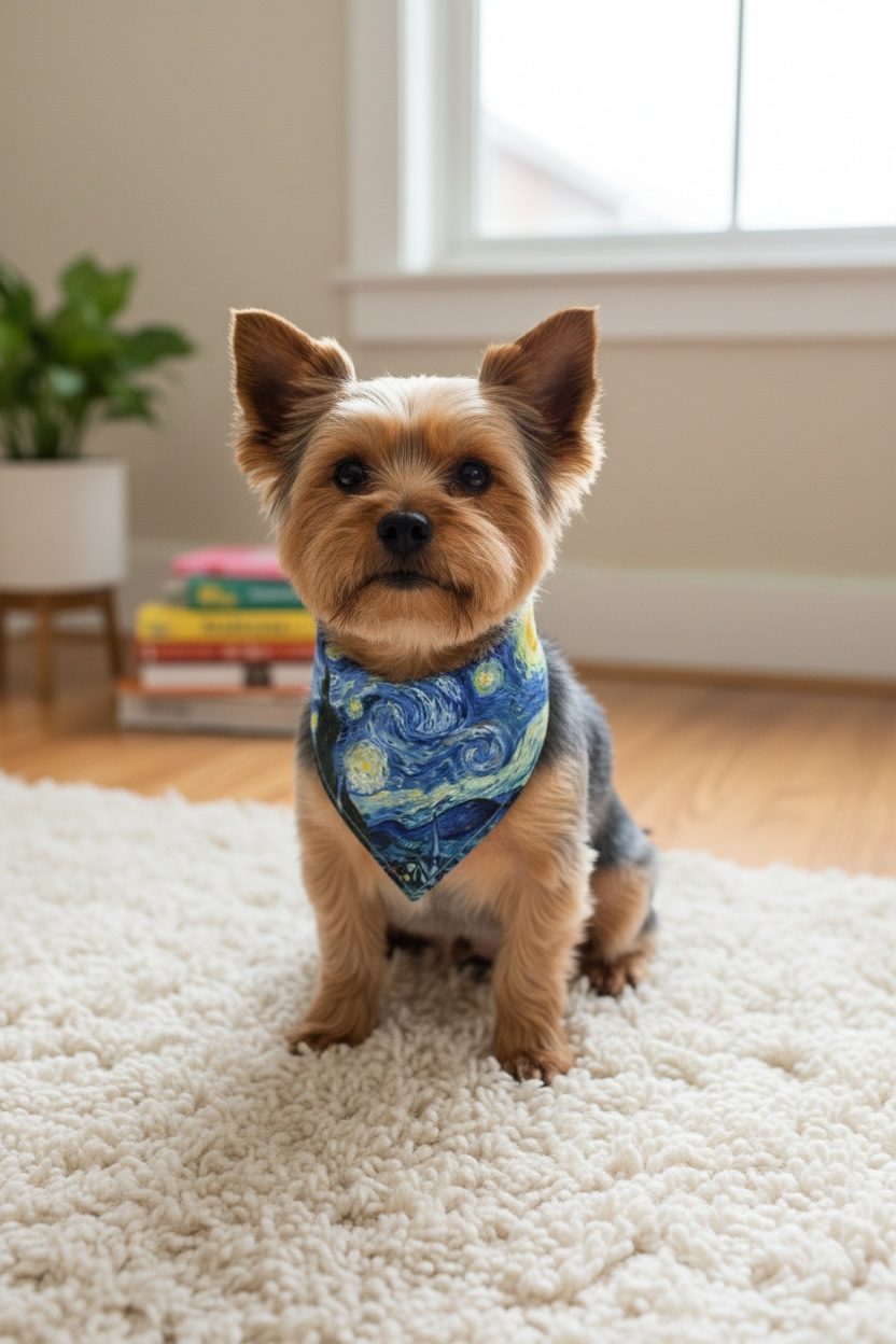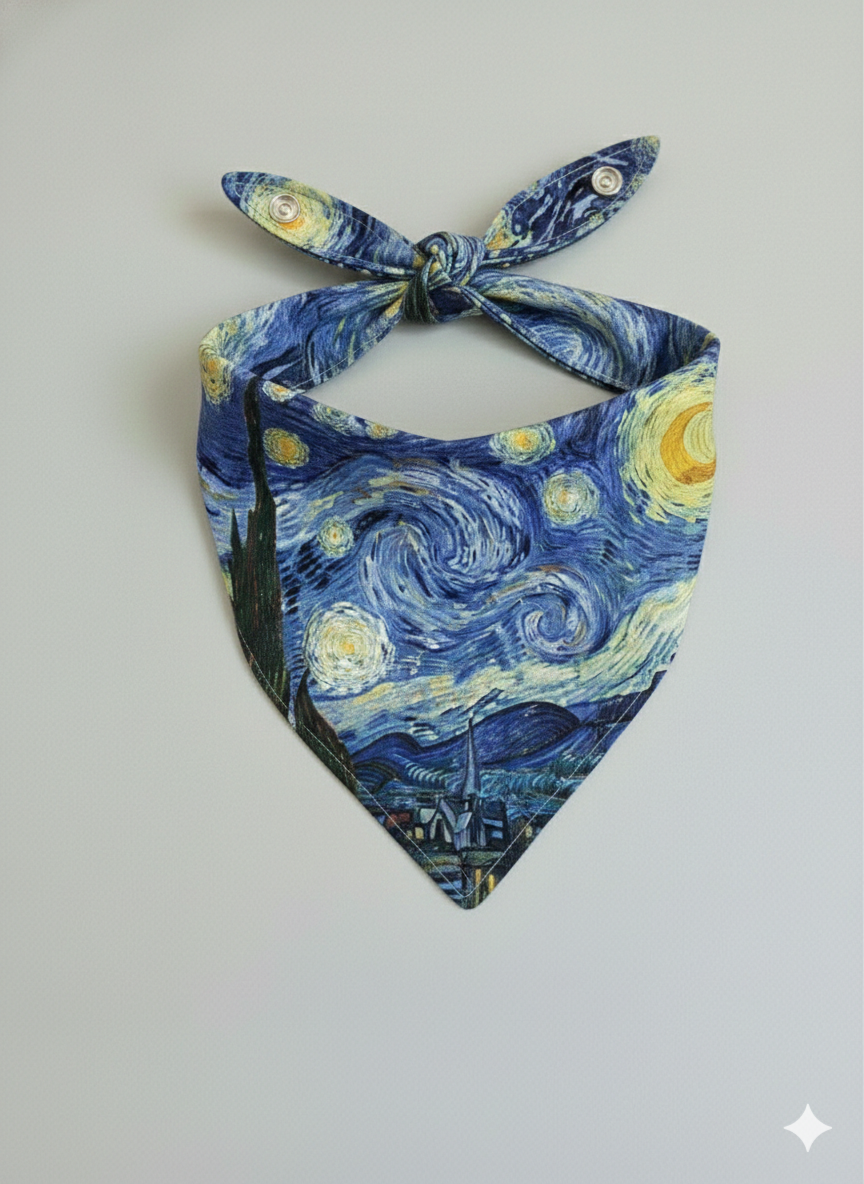 Elevate your dog’s style to "fine art" status with our Starry Night Dog or Cat Bandana. Inspired by the iconic swirls and vibrant blues of the post-impressionist era, this accessory is designed for the dog who is truly a work of art.