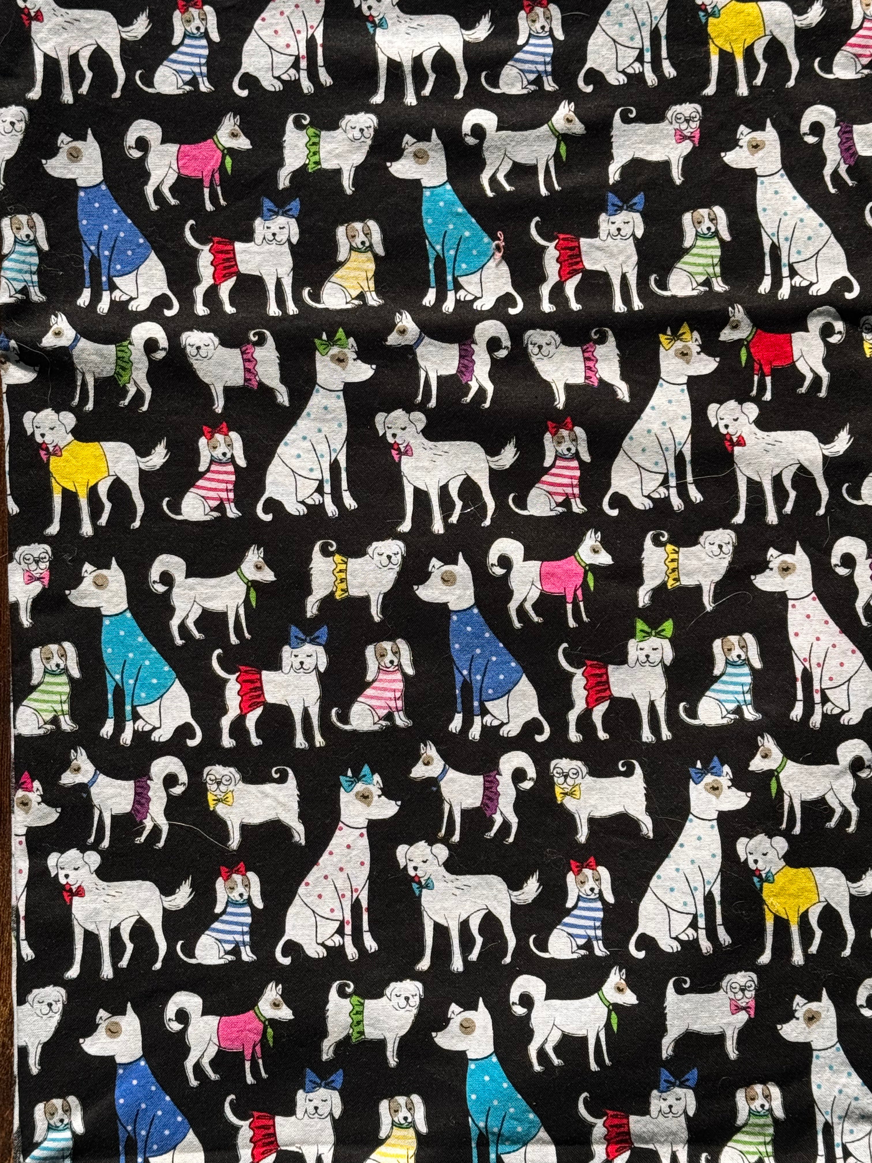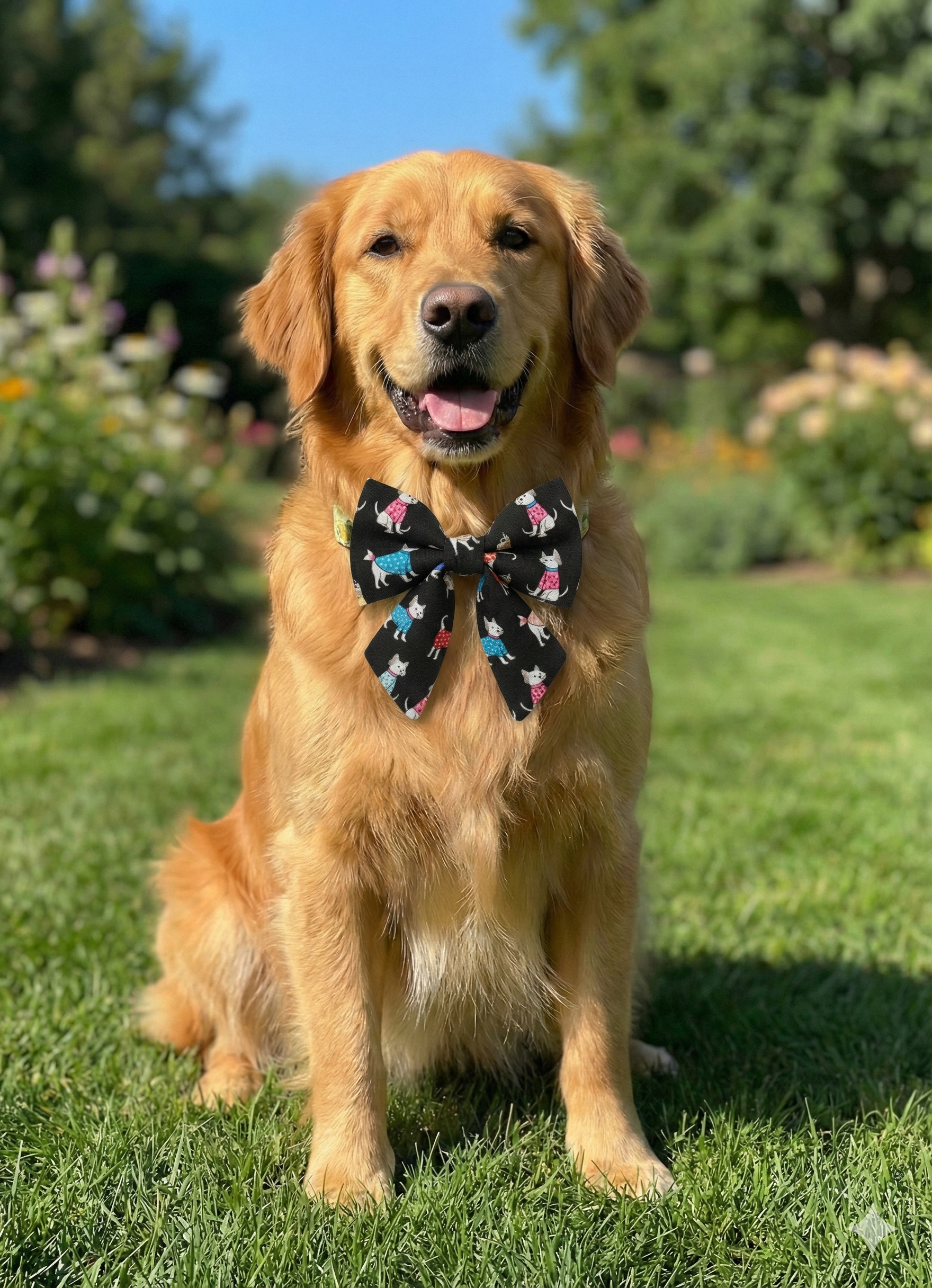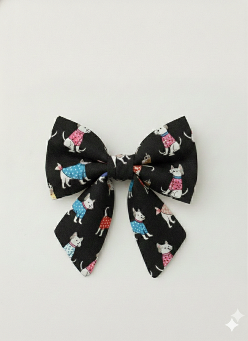 Set against a sleek black background, this whimsical print features charming white pups dressed in their finest pink and blue polka-dot knits. It’s a playful, pop-of-color accessory that looks striking on any fur color, from light creams to dark chocolates.