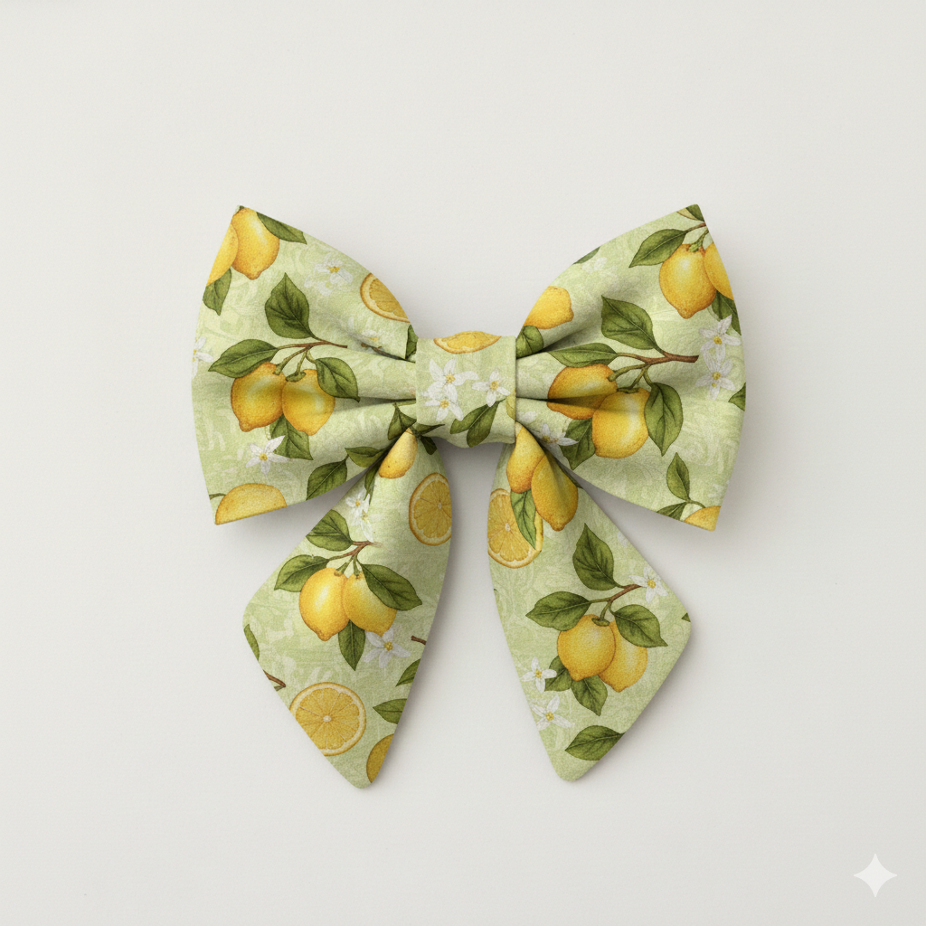 Brighten your pup's wardrobe with this cheerful lemon-inspired bow, designed to capture the essence of sun-drenched summer days. The striking combination of golden yellow lemons and verdant green foliage creates an eye-catching accessory that celebrates your dog's naturally radiant personality.