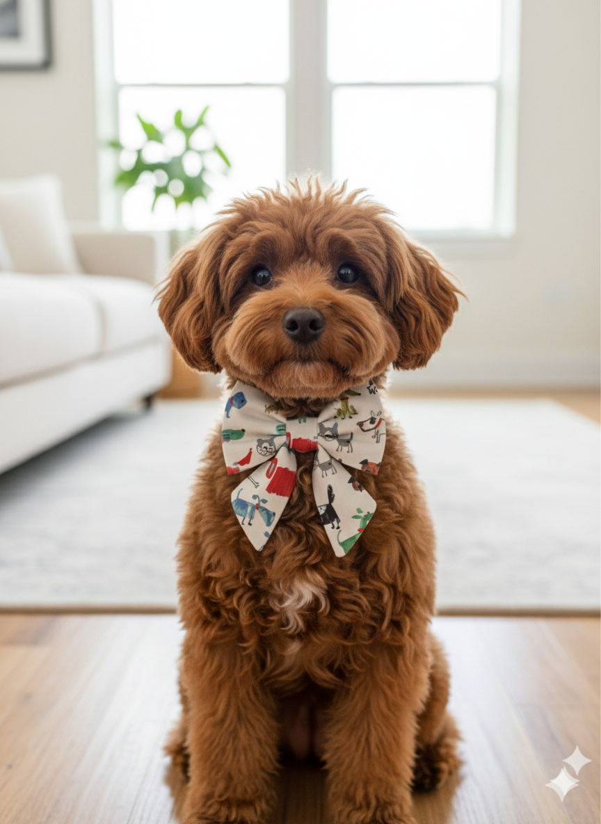 Charming canine-themed bow tie accessory featuring vibrant multi-color imagery, designed for both dogs and cats. Equipped with secure hook and loop fastening for reliable collar attachment.
