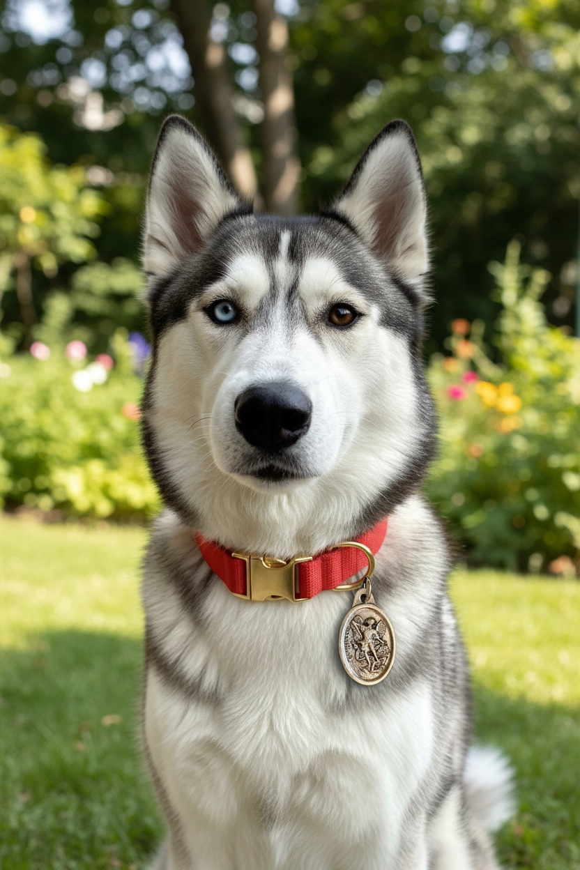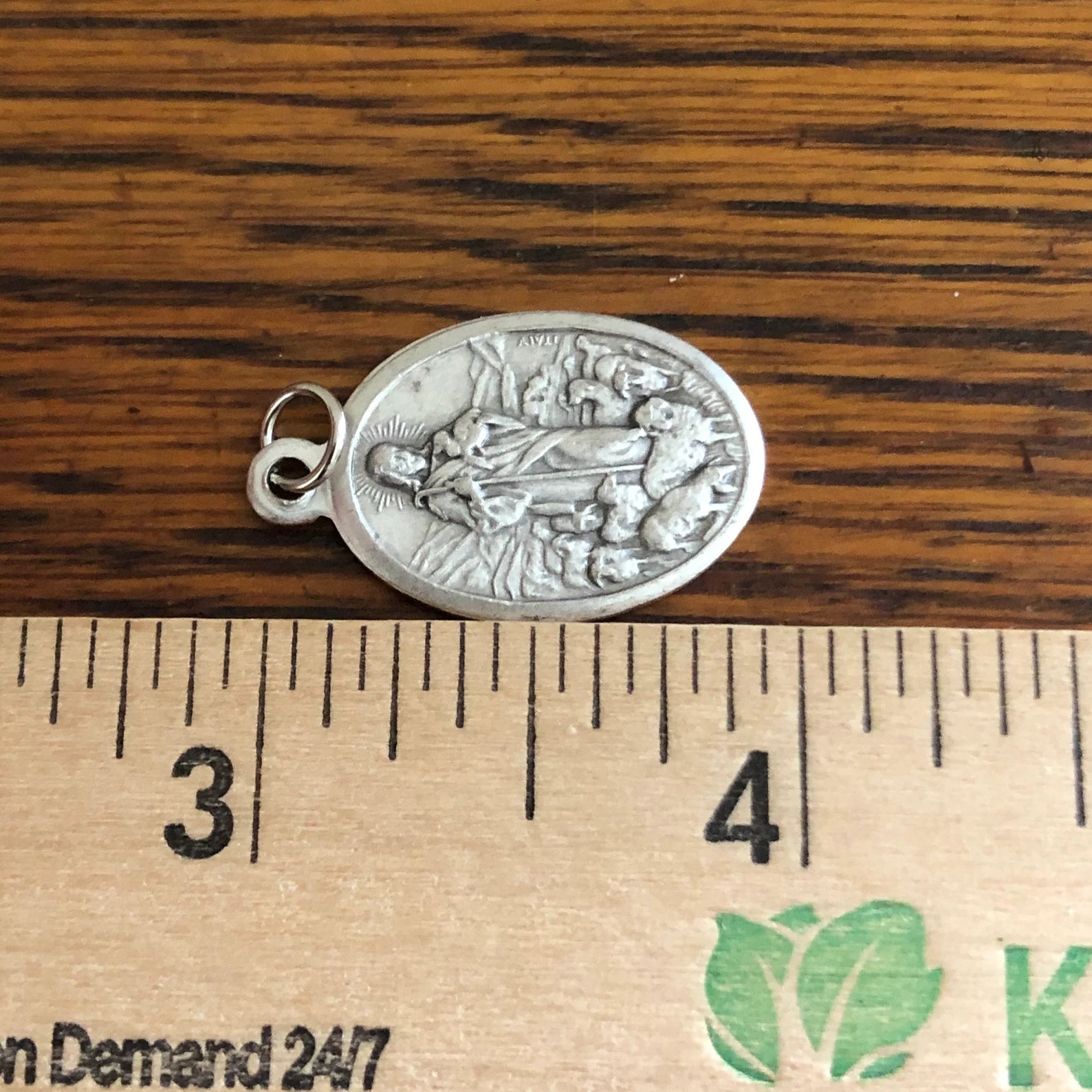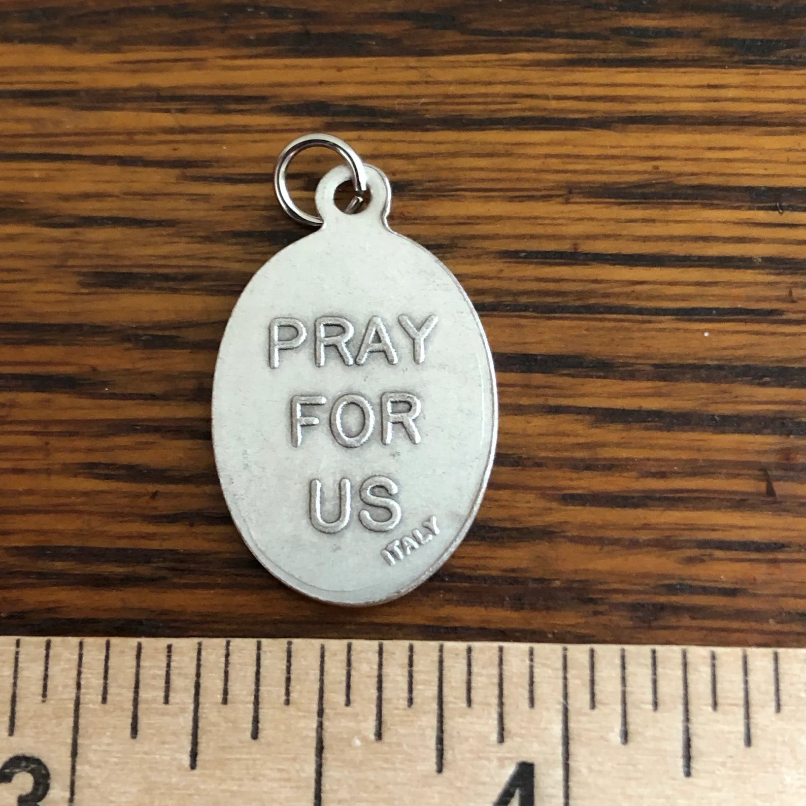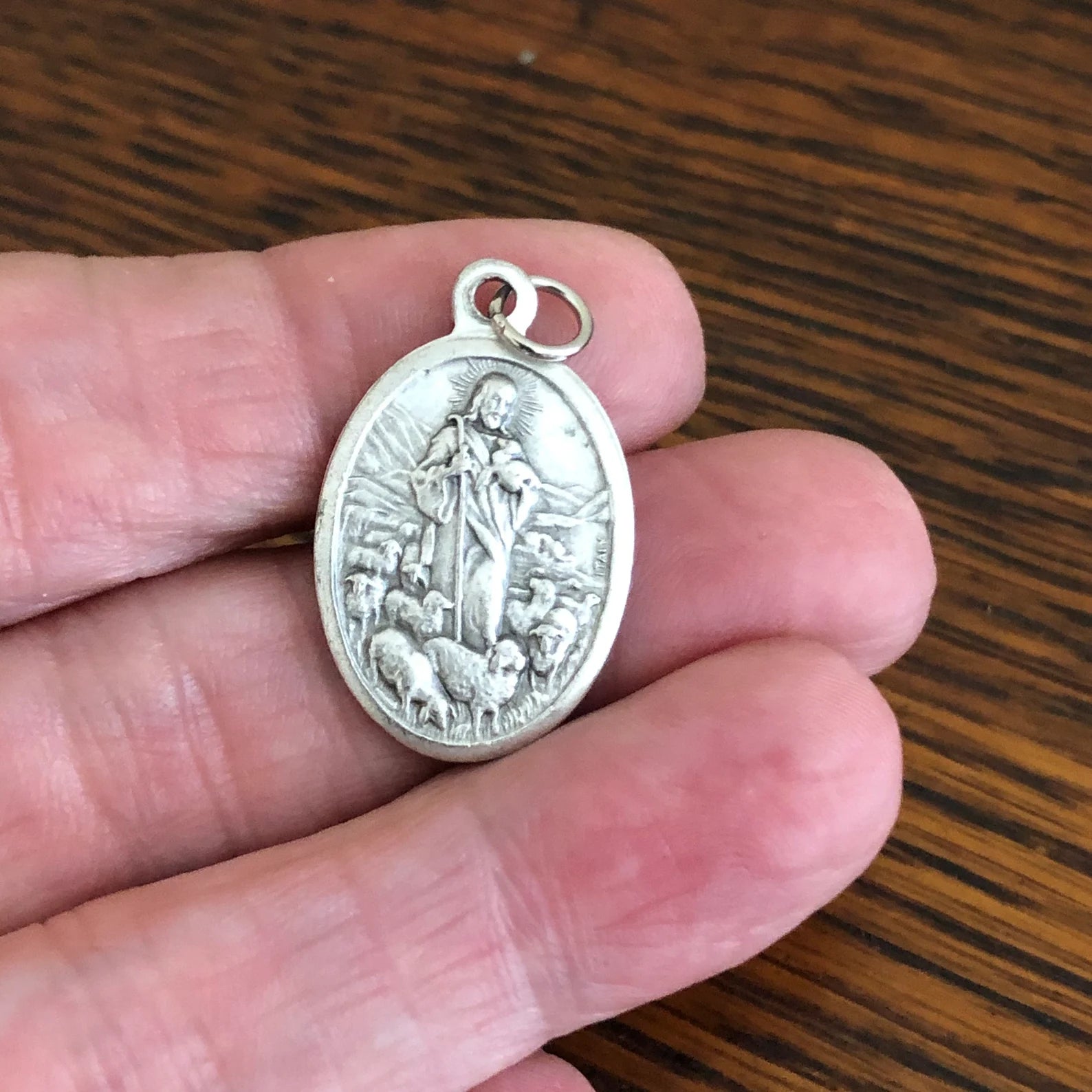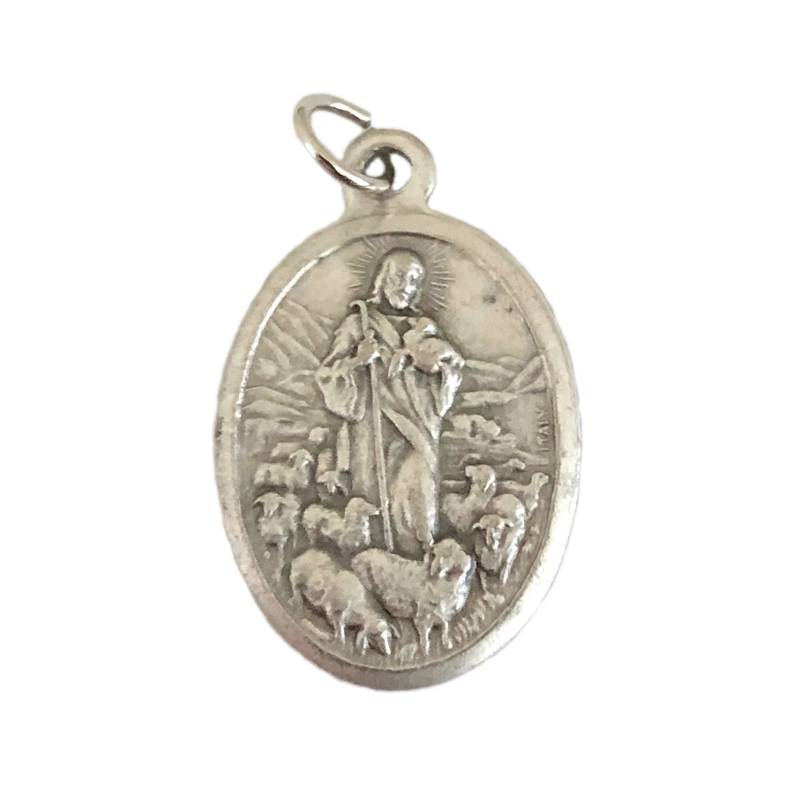 Jesus the Good Shepherd pendant medal or charm with Pray for Us on the back. Great for your most precious pet's collar. Measures 1" high x 5/8" wide.