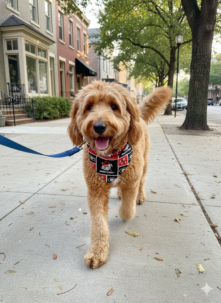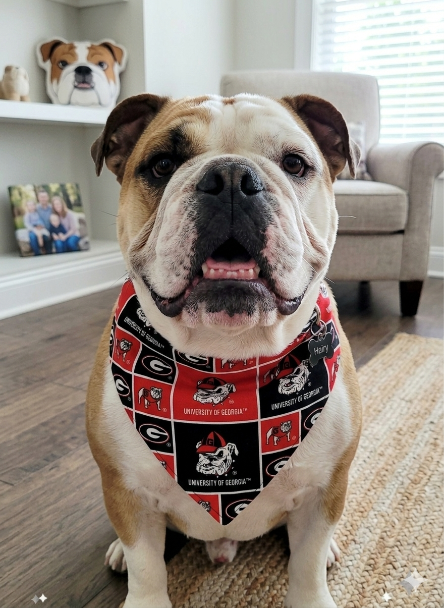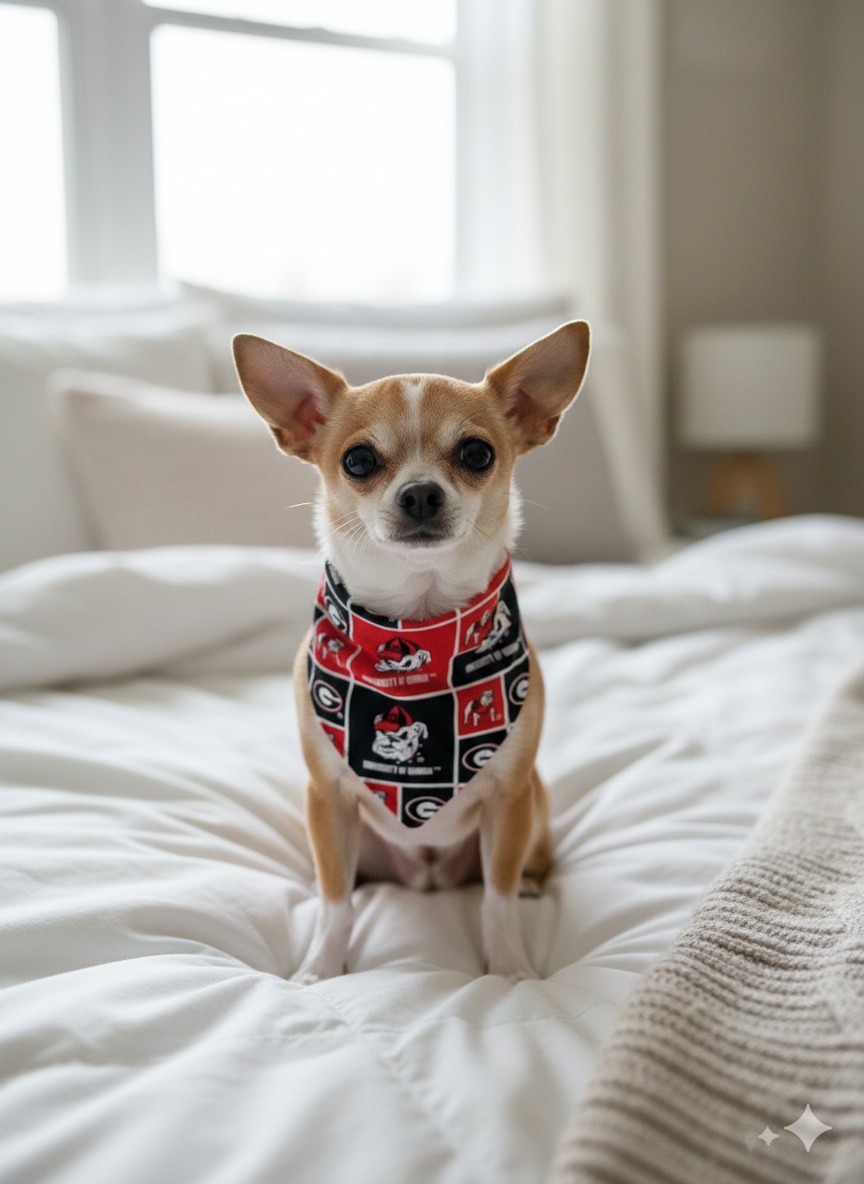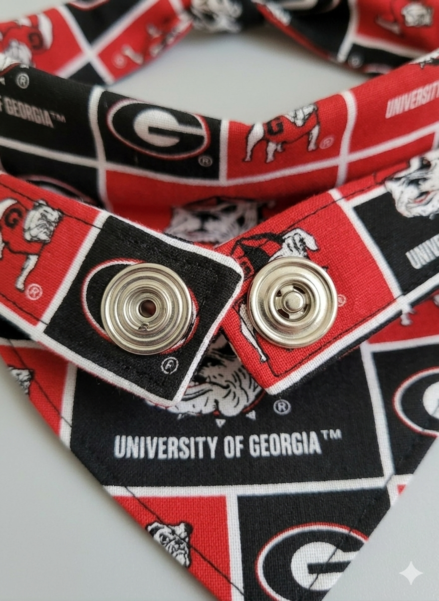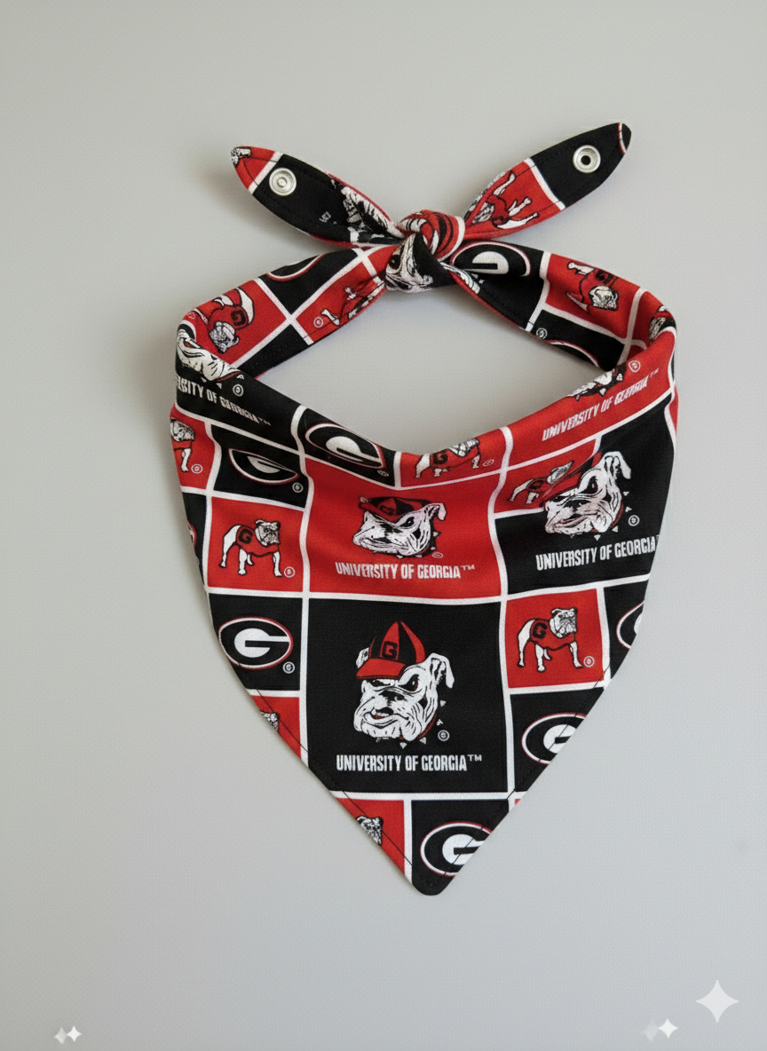 Get your four-legged fan ready for Saturday in Athens! This Bulldogs-inspired bandana features a vibrant red and black collage of helmets and gear—the perfect accessory for tailgates, walks around the Arch, or victory naps on the couch.