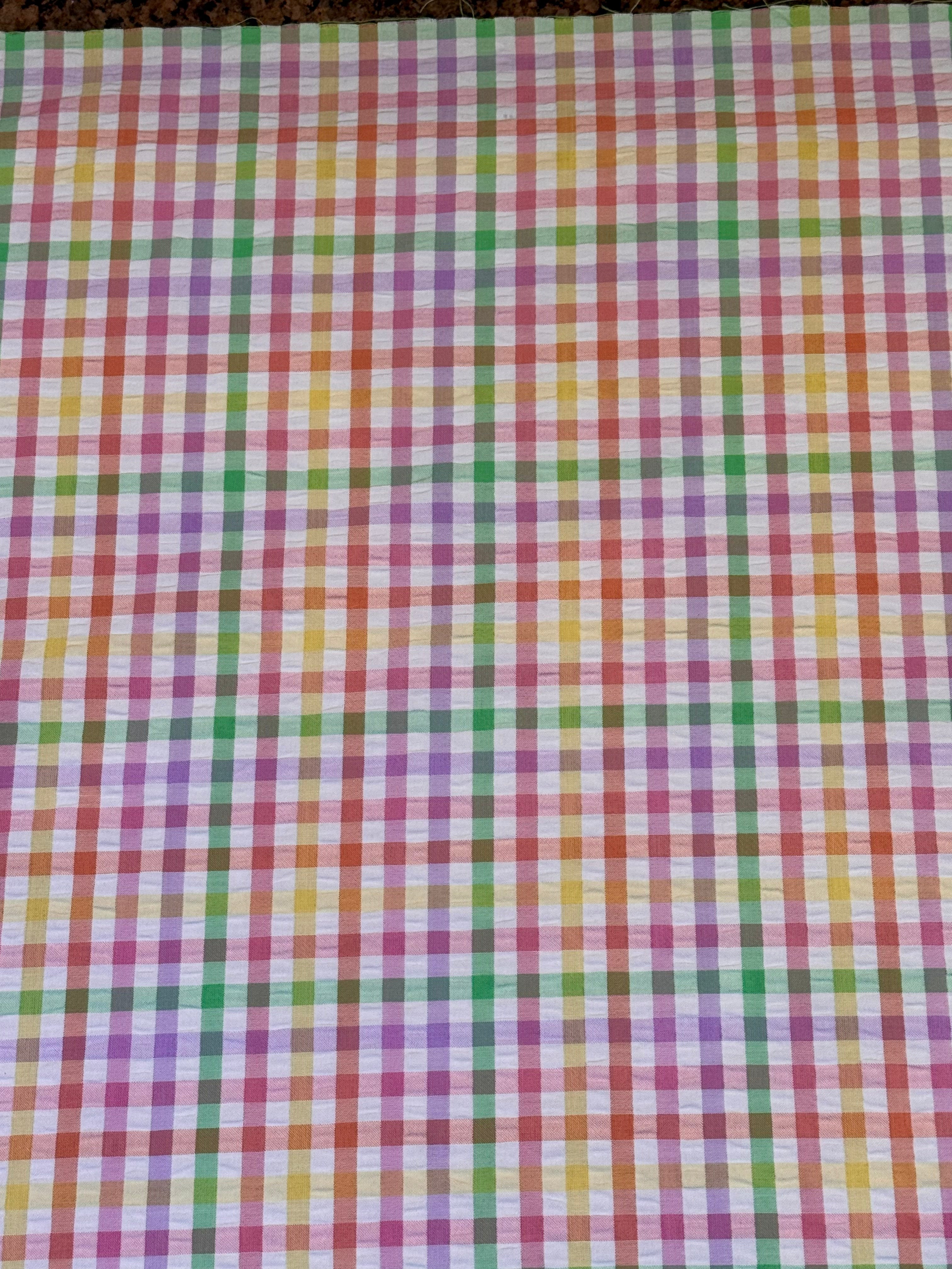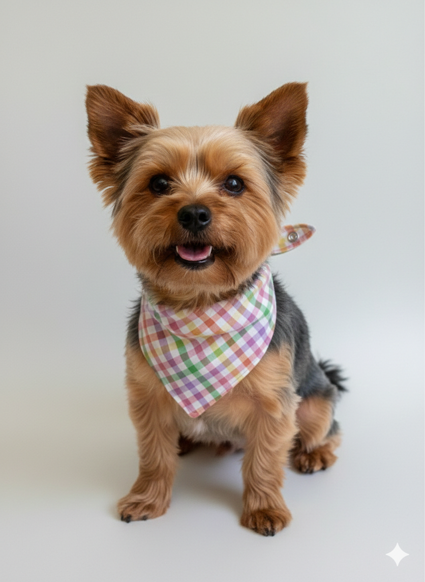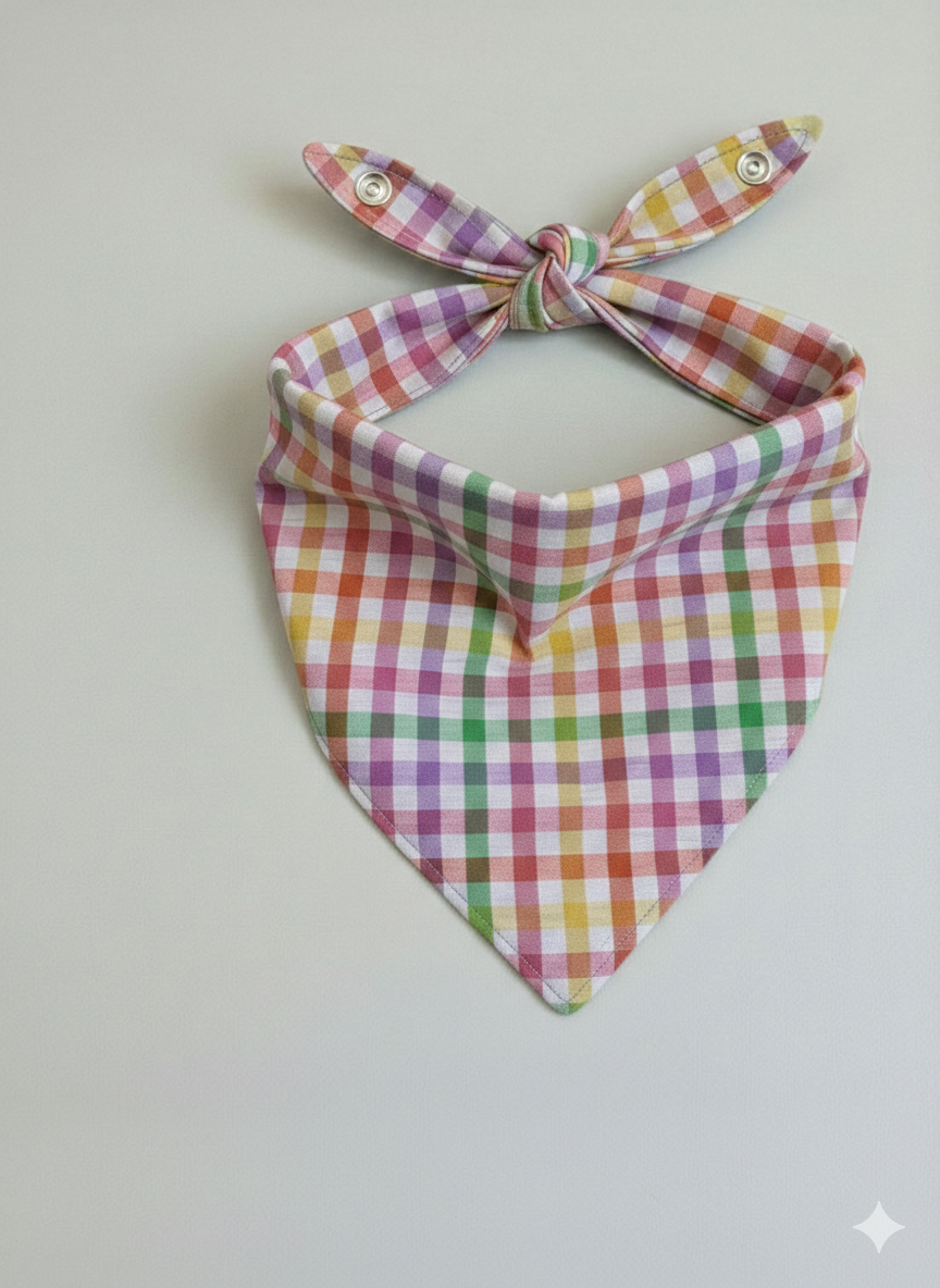 Add a splash of color to your pup's wardrobe with our Seersucker Multicolored Plaid Bandana. This vibrant accessory combines classic prep with modern convenience, making it the perfect choice for sunny walks and brunch dates.