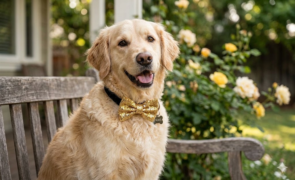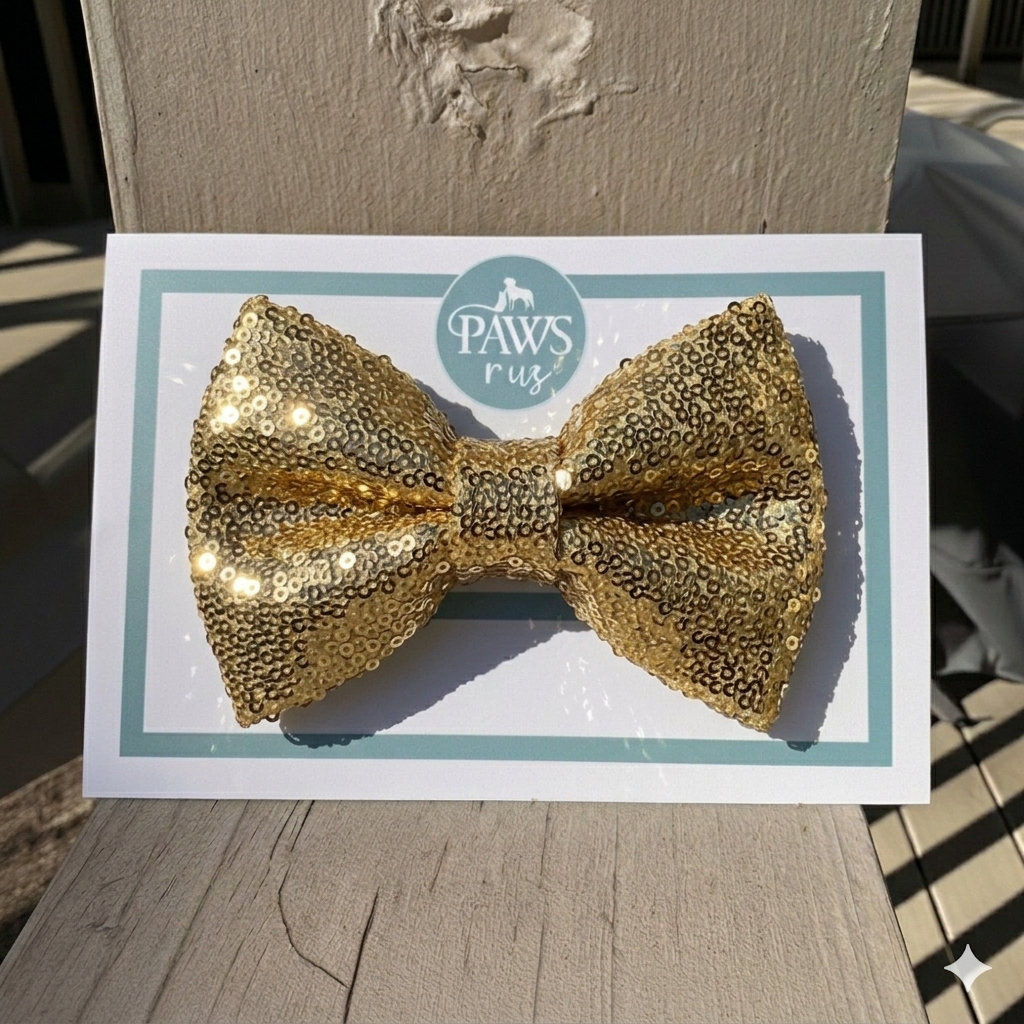 Make a bold statement with this eye-catching gold sequined bow tie, designed to transform your pet into the star of any occasion. Crafted with shimmering sequins that catch the light beautifully, this accessory adds instant glamour to your dog or cat's appearance.